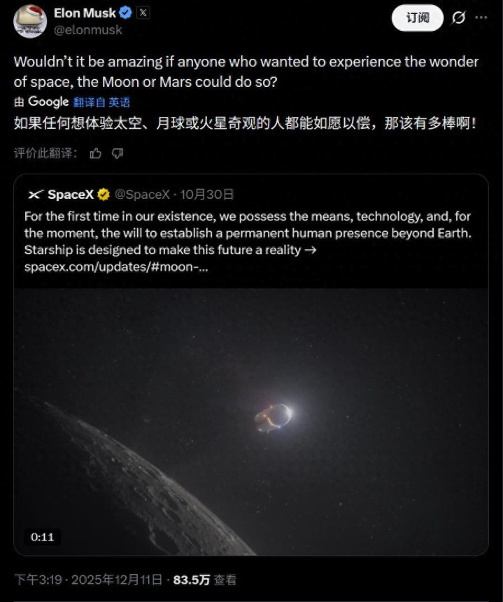 2025年12月11日,埃隆·马斯克在X平台发帖,引用SpaceX声明,感慨道:“如果任何人想体验太空、月球或火星的奇妙,都能做到,那该多棒!”这一简短却富有诗意的提问,点燃了无数人心中的星辰向往。它不仅是对SpaceX星舰项目的致敬,更是对人类太空未来的大胆预言。